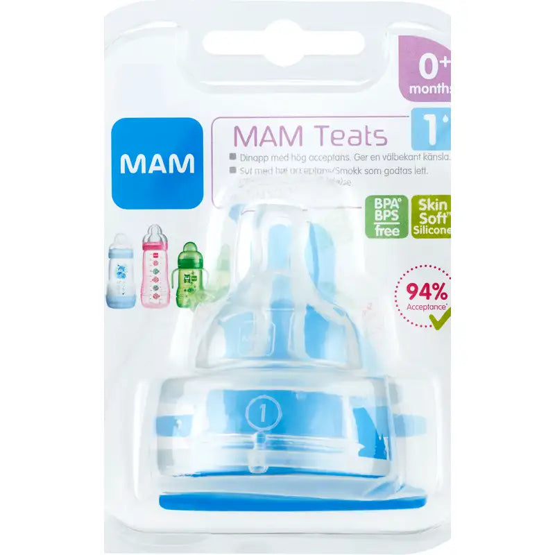 Flaskesut i silkeblød silikone, MAM SkinSoft, hvis overflade minder om mors hud og gør det nemt at skifte mellem amning og flaske. Størrelse 1 er til modermælk. Passer til alle flasker fra MAM.