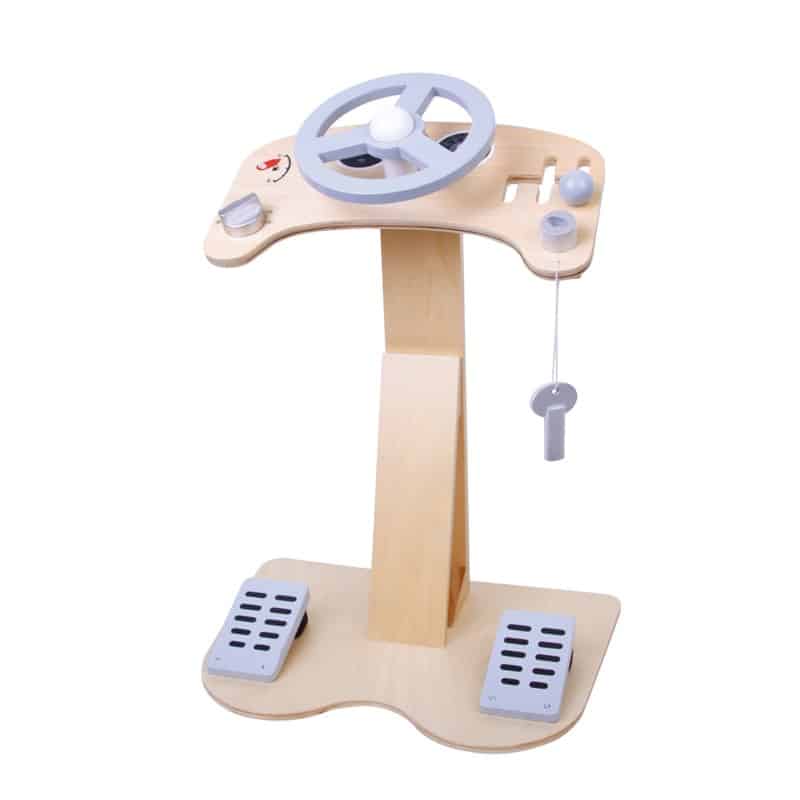 MaMaMeMo Bilrat i træt. Sæt nøglen i, drej på knappen, træd sømmet i bund og kom op i gear. Rattet har knap med kliklyd, speedometer og benzinmåler med flytbare visere, gearskift, nøgle på snor, og pedaler, som kan trædes i bund. Super sjov billeg for de små.