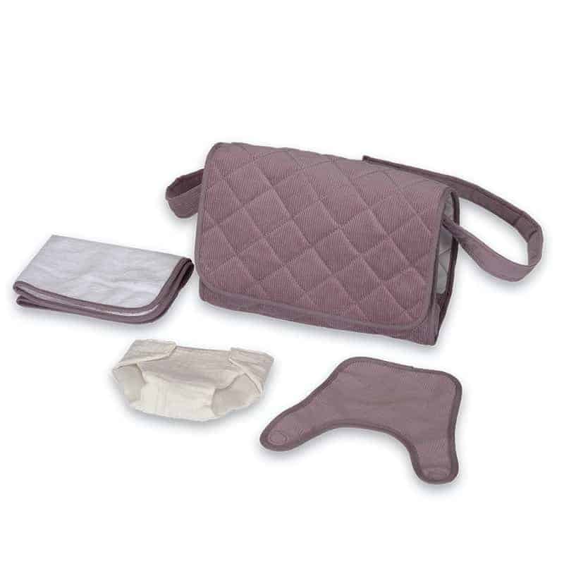 Tasken er syet i det lækreste fløjlsstof, der matcher det fine spisesæt og liftene i samme serie. Skulderremmen sidder sammen på midten med velcro og er justerbar. Selve tasken åbnes/ lukkes med velcro. Indvendigt er der en stor meshlomme, med masser af plads til tilbehør. Folder man tasken helt ud, kan den bruges som liggeunderlag til dukken.