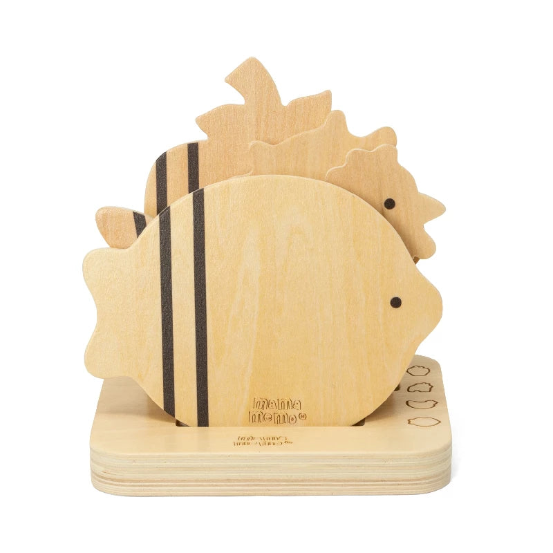 De 4 forskellige skærebrætter er udformet som æble, fisk, fugl og ko og ligger op til at man kan få sig en god snak om, hvornår man skal bruge de forskellige skærebrætter, og hvornår man skal skifte.