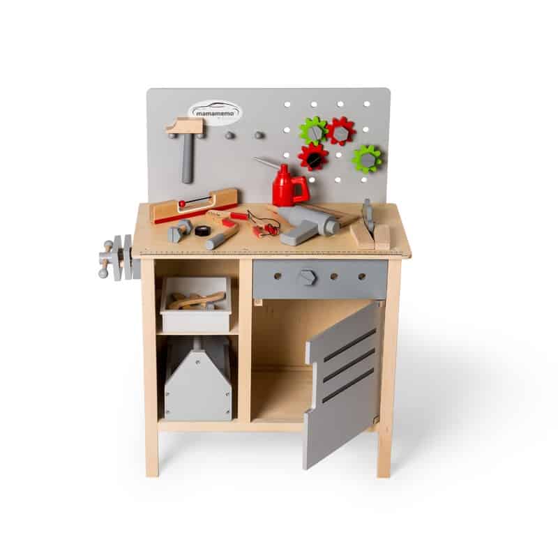 Mamamemo Værktøjsbænk må være en hver dreng- eller piges drøm. Hvad enten man er en lille tømrer, snedker eller bilmekaniker så vil arbejdsbænken kunne anvendes.
