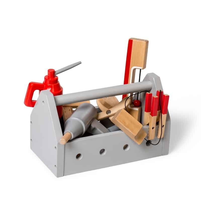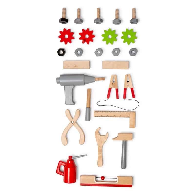 Der medfølger bl.a. boremaskine, oliekande, vatterpas, startkabler, vinkel, hammer og meget andet, i alt 25 dele altsammen i træ.