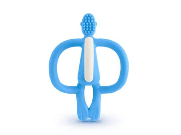 Matchstick Monkey Bidering - Lyseblå. Sød lille bidering af blød silikone med ergonomisk design, så de små fingre nemt kan få fat i- og holde ved den. Bideringen er blød mod babys ømme gummer, når tænderne finder vej ud. Abens baghoved er designet med små bløde knopper, som kan afhjælpe kløe på gummerne. Den kan puttes i fryseren, så den er kold og dejlig at bide i.
