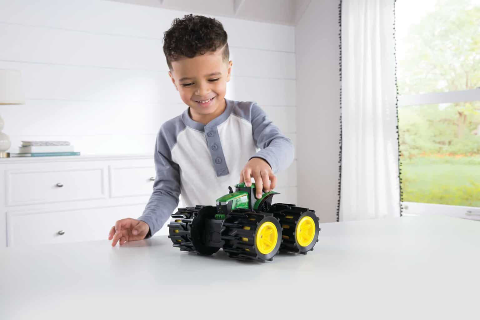 John Deere traktor med megahjul der klarer alle former for terræn! Hjulene på denne vilde traktor kan gøres endnu bredere ved at trykke ned på kabinen. Ideel til børn fra 3 år.