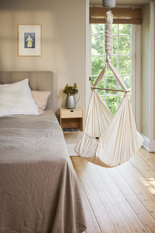 Blød og slidstærk slyngevugge i 100% økologisk bomuld, hvor der medfølger en blød madrads med 100% polyesterfyld.