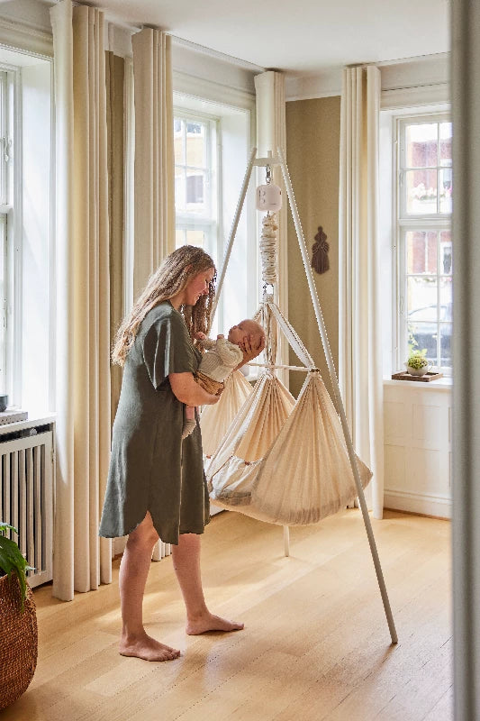 MEMBANTU slyngevugge efterligner forældrenes trygge favn og bløde bevægelser og former sig om barnets krop. Slyngevuggen, der også kaldes hængevugge eller fjedervugge, giver din baby en tryg og behagelig følelse. Den er perfekt til urolige babyer eller babyer, der sover relativt korte lure. Du kan placere den stort set, hvor du ønsker det, og du kan endda tage den med til bedsteforældre, venner eller i mødregruppen blot du har det rette tilbehør.