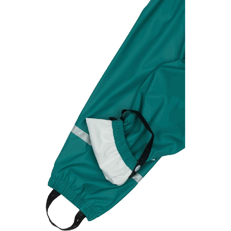 - De justerbare fodstropper kan sættes under gummistøvlerne, så bukserne bliver siddende, og fødderne forbliver tørre. Med et praktisk navneskilt med plads til flere navne kan regntøjet gives videre, så det får nyt liv hos endnu et barn.