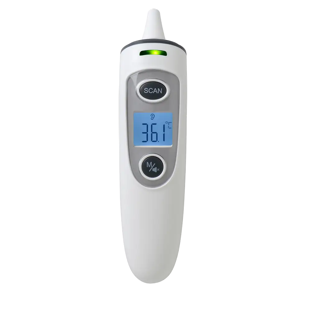 Beholdes hætten på fungerer termometeret automatisk som et kontaktløst termometer, hvor man kan måle temperaturen ved en måling på panden. Det er specielt hensigtsmæssigt, når man overvåger temperaturen på et sovende barn.