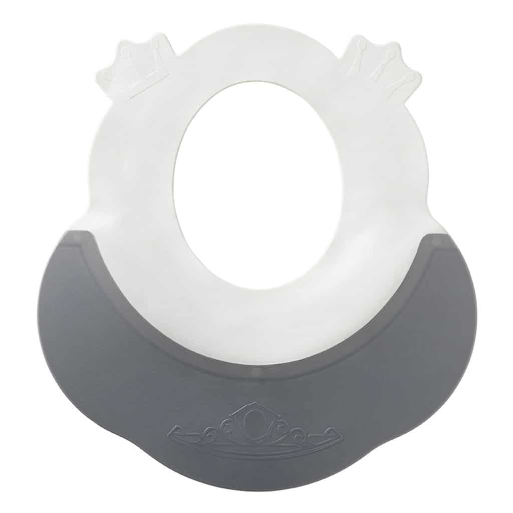 Mininor shower cap. Shampooskærm fra Mininor der beskytter barnet mod at få vand og sæbe i øjnene Undgå at børnene får vand eller shampoo i deres sensitive øjne, når de får vasket hår. Børn kan ikke lide at få vand/shampoo i øjnene og ned i ansigtet, fordi det svier og er ubehageligt. Denne badekasket sættes på hovedet og forhindrer at vand og shampoo løber ned i øjne og ansigt. Slut med gråd, når der bades. Den hvide kant er i blød silikone (TPE) der slutter sig tæt omkring hovedet. Det forreste grå stykke er lavet i fast plast (PP) der leder vandet væk. Passer til hovedomkreds på 36-56 cm