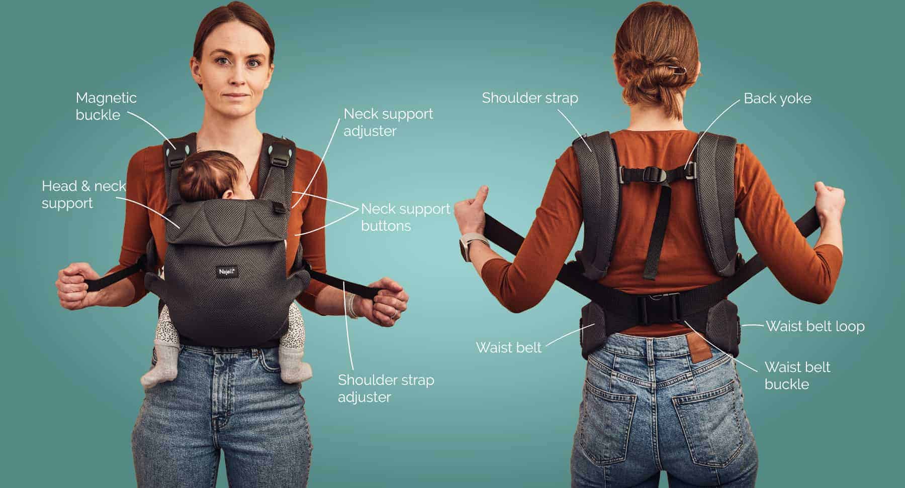 Najell Easy gør alting nemmere. Du skal ikke længere bekymre dig om at justere bæreselen, så du bærer den korrekt. Vores mål er, at du kan bære dit barn helt uden bekymringer.