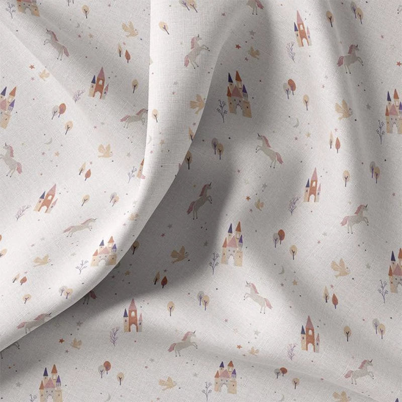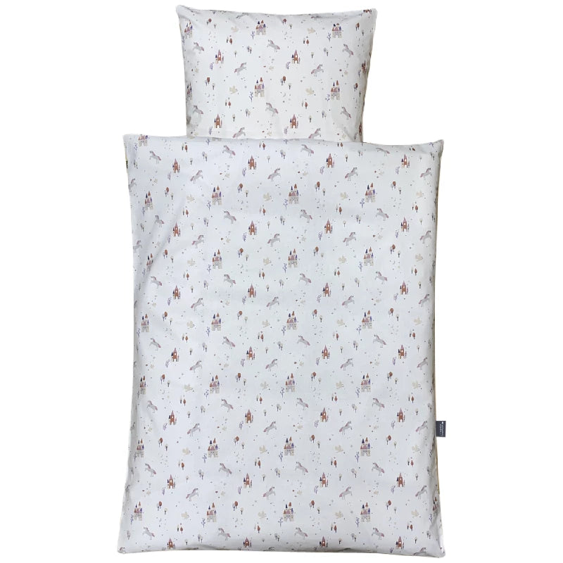 Eventyrligt baby sengesæt fra Nørgaard Madsen. Baby sengesættet er i en duset rosa farve med fine enhjørninger og slotte, produceret i en blød Oeko Tex certificeret bomuld og syet i Danmark.