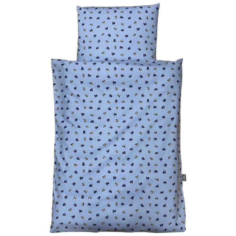 Baby sengesæt fra Nørgaard Madsen "Made in Denmark" i et skønt lyseblåt print med traktorer i blålige nuancer. Stoffet er en blød bomuld poplin og Oeko Tex certificeret. str. 70×100+40×45 cm.