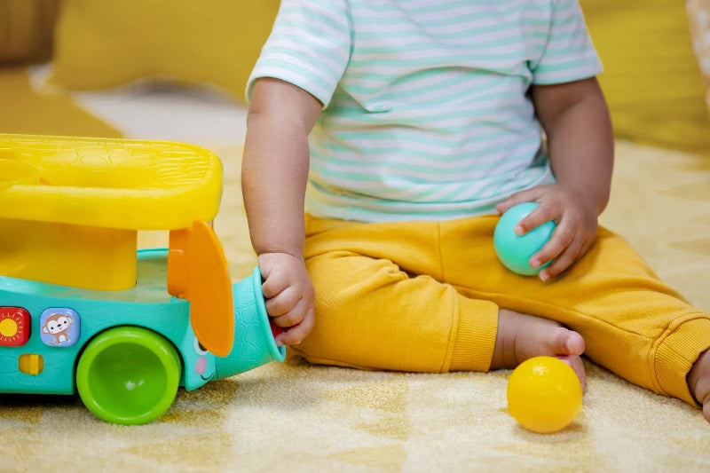 - Boldspillet i Bright Starts Pop & Roll Safari Bus træner finmotorikken og sørger for gode grin; smid boldene i de to øverste huller, eller klem dem ud af elefantens snabel.