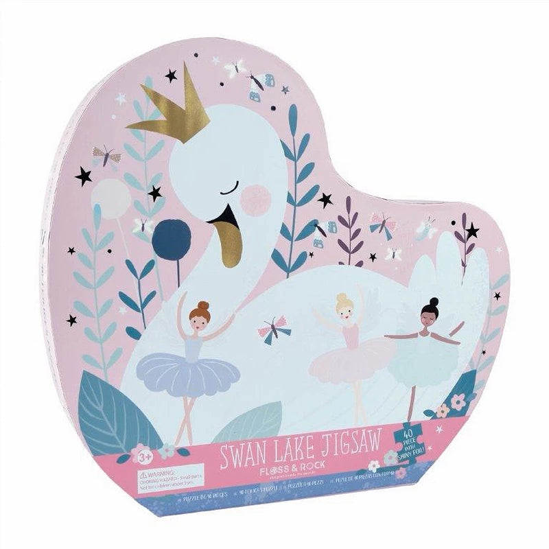 En svaneformet æske og et svaneformet puslespil. Indeni har du 40 store brikker til at udgøre det smukke svaneformede puslespil med en smuk scene af balletfeer, svaner, søer og fortryllede venner. Både puslespillet og æsken har skinnende folierede detaljer.