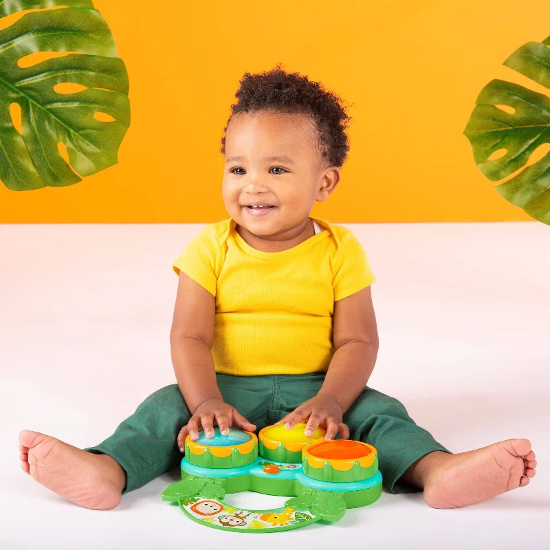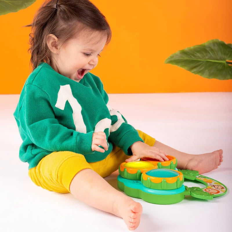 Hvad er musik for mor og fars ører? Babys søde små grin, selvfølgelig. Med Safari Beats musiklegetøj fra Bright Starts vil der være masser af grin og fnis. Hvert tryk på en farvestrålende knap vil få din lille til at hoppe i takt. Skift fra trommetilstand til meloditilstand og opdag en helt ny safari-verden af lyde. Håndtaget er let at gribe om, så din lille party-abe kan hoppe rundt og dele de sjove melodier overalt, hvor han eller hun bevæger sig. Men uanset om der bliver lavet trommelyde på trommen eller sunget søde sange, så bliver det helt sikkert en vild koncert, som du ikke vil gå glip af.