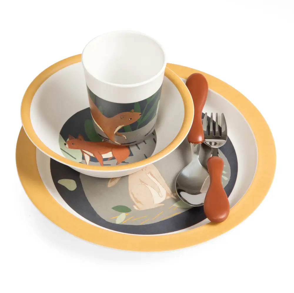 På den flade tallerken er der en illustration af haren Moonlight i sin hule under skovbunden og i bunden af den dybe tallerken finder barnet egernet Star på vej i trætoppene i nattemørket. På koppen er bjørnen Woody på vej gennem skoven midt om natten. Bestikket er designet med hensyntagen til små munde og hænder. Det ligger godt i barnets hånd, hvilket gør det lettere for barnet at lære teknikken. Børnebestikket er fremstillet i rustfrit stål med greb af plast.