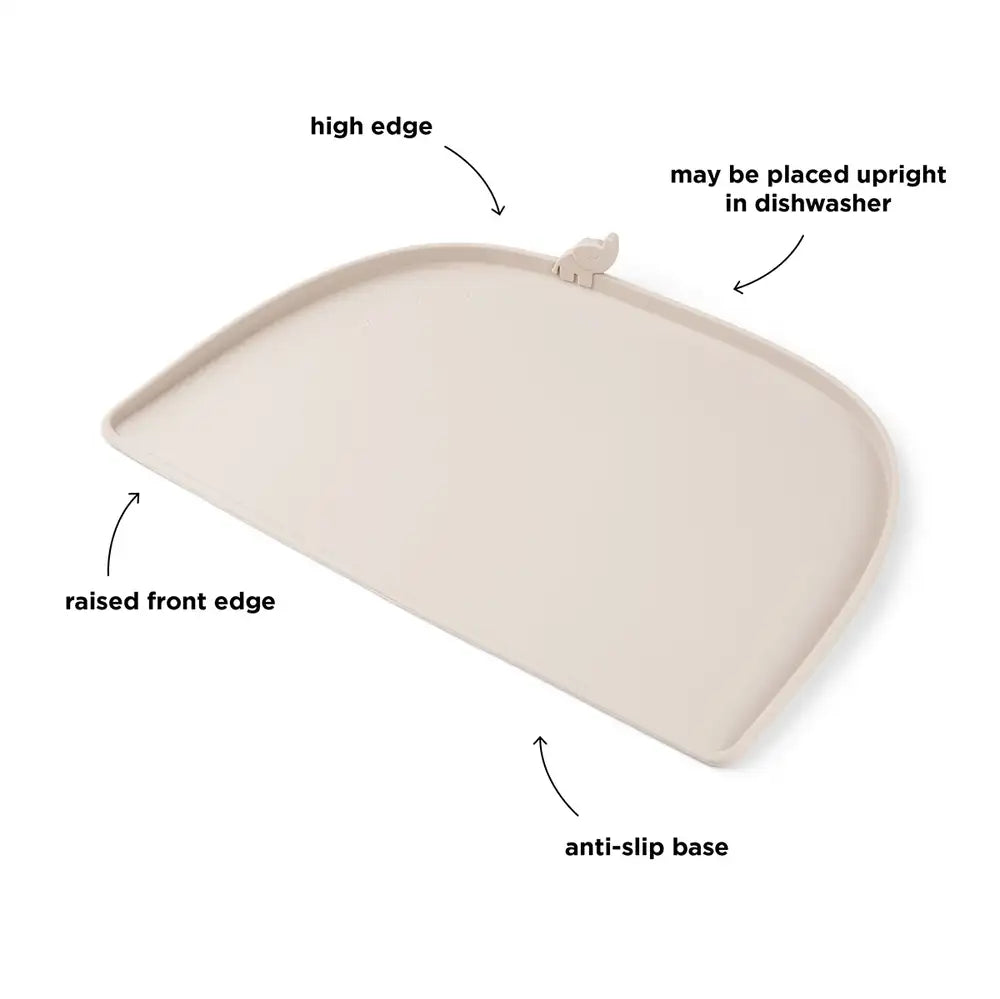Silikone dækkeservietten har en praktisk kant foran samt en højere kant på siderne og bagved, der stopper spildt mad og drikke, inden det når resten af bordet. Den er nem at tørre over eller rengøre i opvaskmaskinen og har antiskrid på undersiden.
