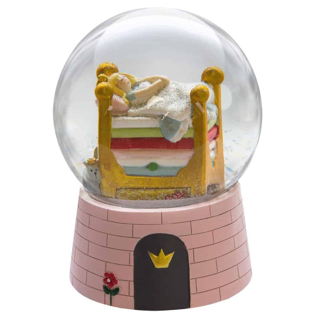 Kids by Friis snekuglen er håndlavet, og når den rystes, drysser der fint glimmer ned over prinsessen på ærten. I bunden kan kuglen trækkes op, og så spiller den en sød melodi: Beautiful Dreamer af Stephen Foster.