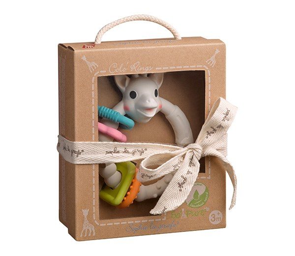 Sophie Giraf So Pure Co'lo Ring. Ranglen er produceret af 100% naturgummi og indfarvet med rene plantefarver. Fyldt med sjove ringe at lege med, og så er den skøn at tygge på - hvilket din barn roligt kan gøre, da ranglen er uden giftige kemikalier.