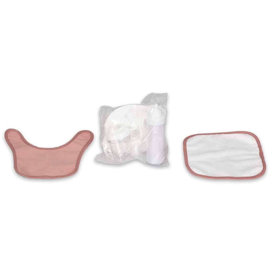 Sættet består af i alt 7 dele: hagesmæk, vaskeklud, sutteflaske med imiteret mælk, drikkekop med tud, gaffel, ske og ruminddelt tallerken.