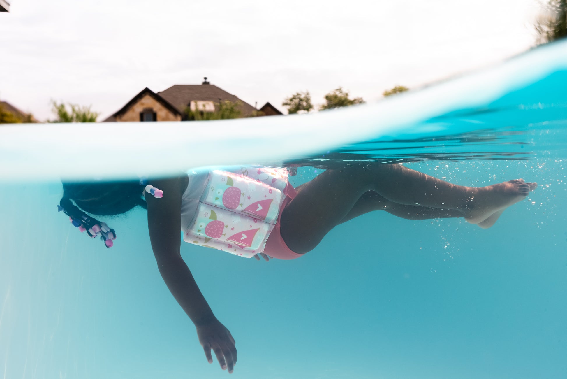 Det justerbare opdriftssystem forklares i detaljer i de instruktioner, der følger med Floatsuit, så du og dit barn kan få en sikker og sjov oplevelse i vandet.