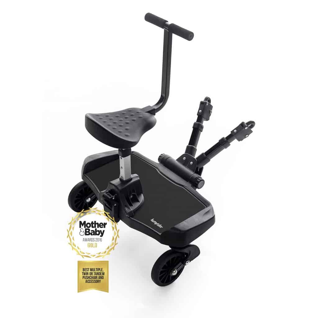 Innovativt 2-i-1 ståbræt, der kan monteres på 99% af alle klapvogne. Sædet monteres let på ståbrættet, når junior bliver træt i benene. Sædet kan vendes til 2 kørselsretninger, samt højdejusteres til 3 positioner. Stødabsorberende skater-hjul.