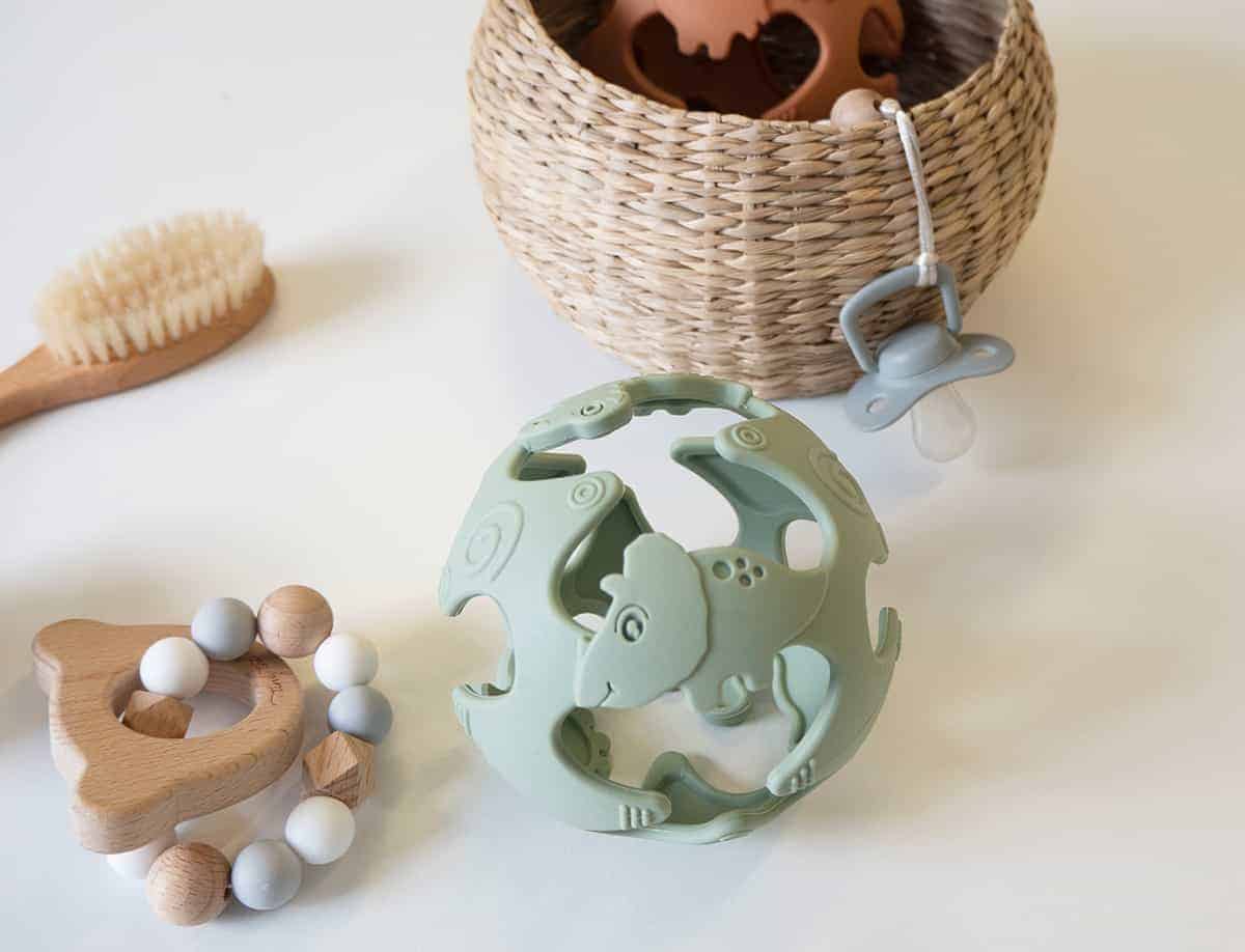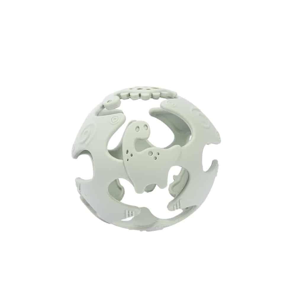 Bold produceret af 100% fødevaregodkendt silikone. Fleksibel og nem at gribe fat om. 4 dinosaurer gør bolden sjov at undersøge, og stimulerer baby's føle og synssans. Blød silikone gør den behagelig at lege med, og masserer nænsomt babys ømme gummer under tandfrembrud. Egnet fra 4 mdr.