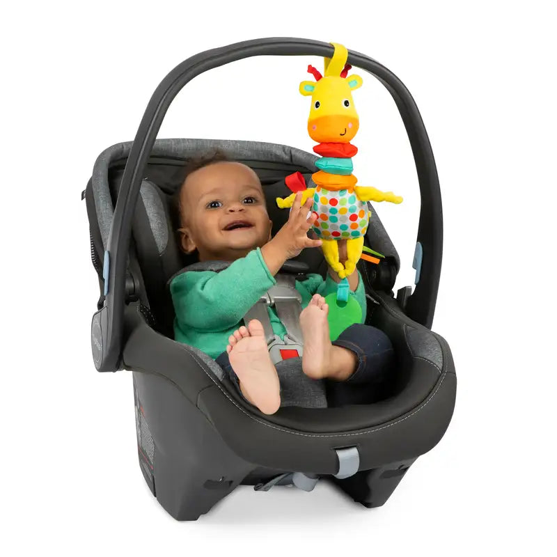 Denne smukke giraf fra Bright Starts, som kan trækkes i og leges med, vil skabe glæde hos dig og dit barn, mens I lærer og leger! Et let træk i bladet får giraffen til at strække sig. Se giraffens krop udvide og trække sig langsomt sammen i takt med 60 sekunders glade melodier. Dette musikalske legetøj fremmer udviklingen af finmotorikken, synssansen og forståelsen af princippet om årsag og virkning Dit barn vil elske de forskellige bløde materialer, der giver barnet mulighed for at udforske giraffen, samt tilbehøret i klare farver, mens du ikke vil kunne modstå de dejlige grin, som dette legetøj frembringer hos dit lille barn!