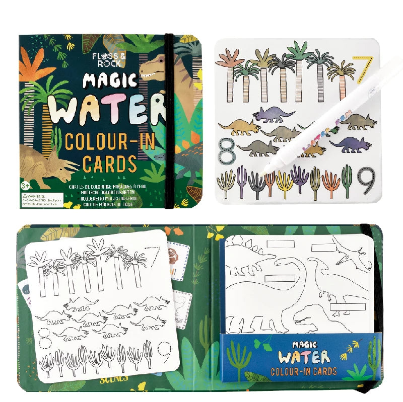 Ikke flere bekymringer over farve på væggene med disse fantastiske 'farveskiftende' vandkort. Sættet indeholder 10 genanvendelige kort og en vandpen. Fyld blot pennen op med vand og leg. Hvert kort har enten ord, tal eller scener at farvelægge i. Det tilskynder også til læring gennem sjov! Disse kort indeholder farverige dinosaurus´er og meget andet sjov.
