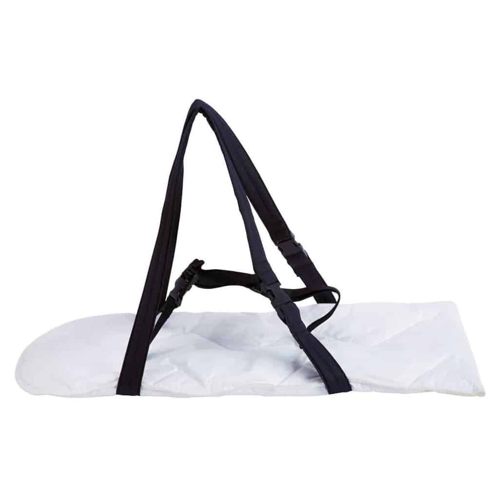 Af sikkerhedsmæssige grunde er bærehankene monteret rundt om bærepladen i stedet for posens betræk! Sørg derfor for at hankene er på pladens underside når
