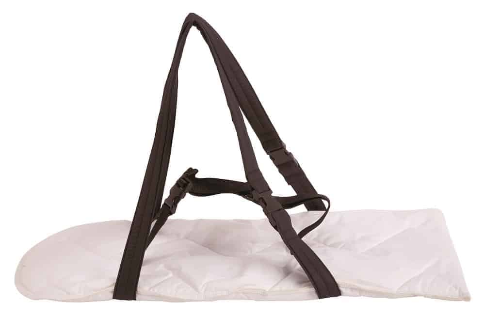 Af sikkerhedsmæssige grunde er bærehankene monteret rundt om bærepladen i stedet for posens betræk! Sørg derfor for at hankene er på pladens underside når bærepladen monteres ind i Voksiposen.