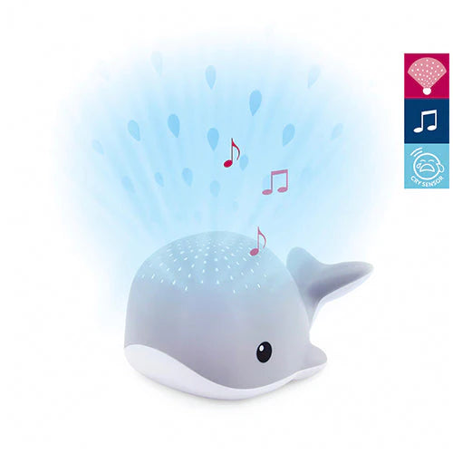 Valen Wally er en tryg ven i mørket. Wally er en lysprojektor og spilledåse i ét! Vanddråber - projiceret i loftet i fire forskellige farver: rød, blå, grøn eller multi-farve, dvs. skifter mellem disse. 3 beroligende melodier - spiller beroligende melodier for din lille: lyde fra havet, hjerteslag og vuggeviser. Automatisk slukning - lyset slukker automatisk efter 30 minutter og musikken efter 15 minutter. Grådsensor - projektoren kan automatisk starte, når din lille begynder at græde. Fastgøres til vuggen - kan fastgøres til vuggen/babysengen ved hjælp af velcrobånd. Egenskaber: Størrelse: 15 x 9 x 8 cm Kræver 3 AA-batterier (ikke inkluderet) Velcro inkluderet Alder: 0+