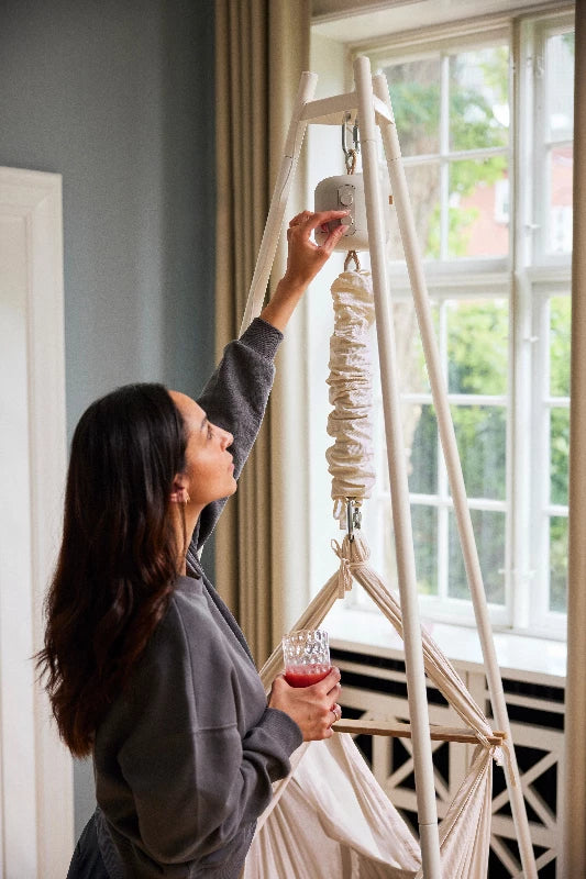 Stativet kan flyttes rundt og samles uden brug af værktøj, alt efter hvor de voksne befinder sig i hjemmet, og det er let at montere både slyngevuggen og motoren i toppen.