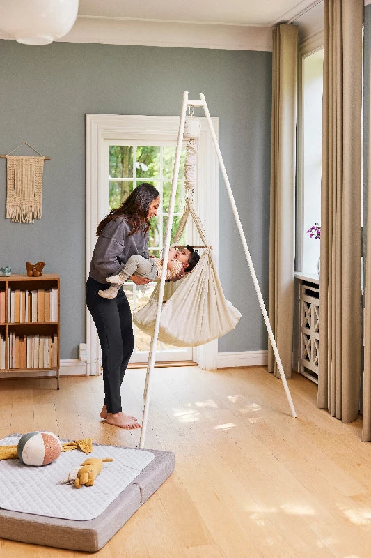 Membantu vuggestativ, er enkelt i sit design og kan passe ind i de flestes hjem. Med et vuggestativ kan du sætte din slyngevugge op alle steder.